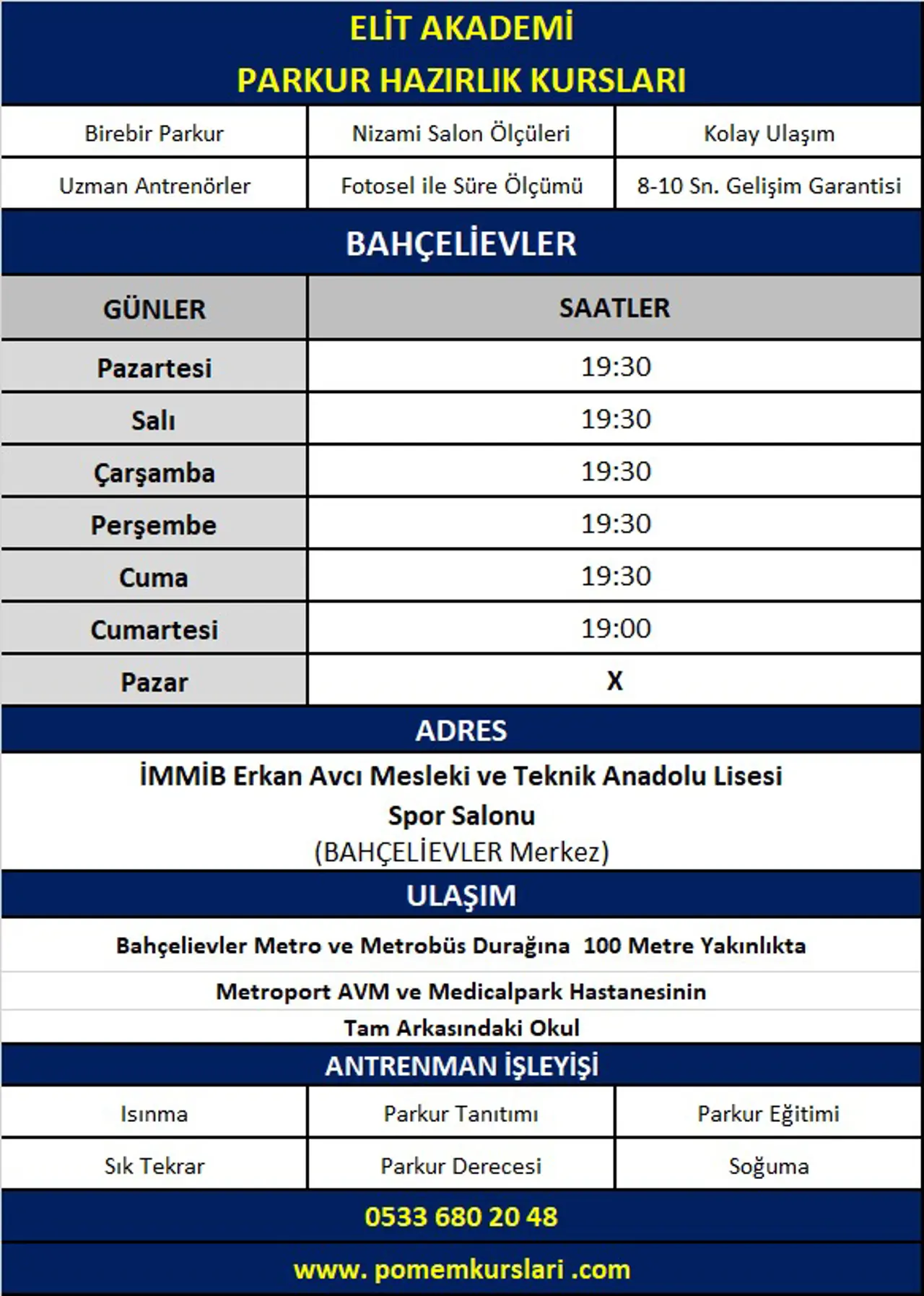 - POMEM PARKUR HAZIRLIK Kurslarımıza Katılan Öğrencileri; Kuvvet, Dayanıklılık, Sürat, Çabukluk Koordinasyon Ve Atletizm Antrenmanlarına Tabi Tutarak Grubun Yetenek ve Becerilerine Uygun Antrenman Yöntemleriyle Gelişimlerini En Üst Seviyeye Çıkarmalarını Sağlıyoruz.